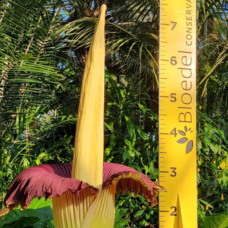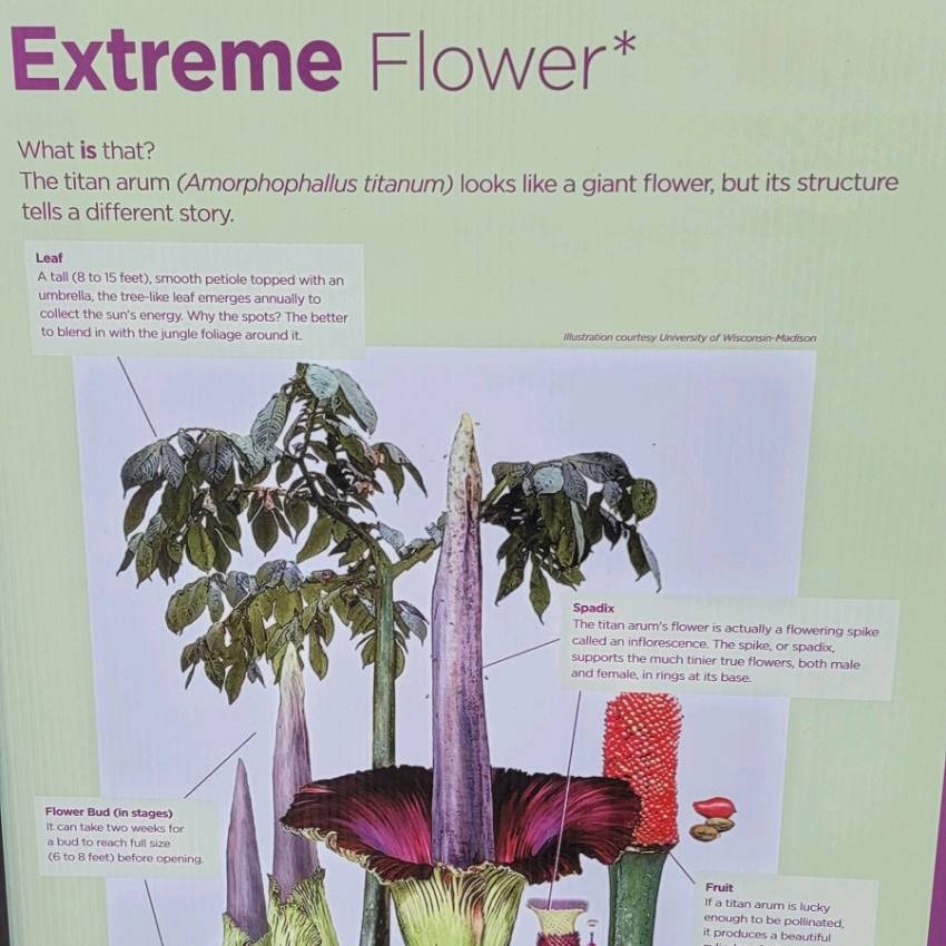 The titan arum looks like a giant flower, but its structure tells a different story. It can take 2 weeks for a bud to reach full size (a whopping 6-8 FEET!) before opening. The titan arum’s flower is actually a flowering spike called an inflorescence. The spike, or spadix, supports the much tinier true flowers, both male and female, in rings at its base.